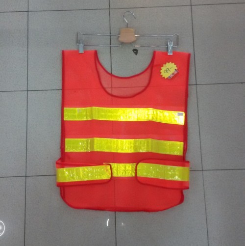 เสื้อกั๊กจราจร สีส้ม แถบสะท้อนแสงสีเขียว ชนิดสวมหัว เป็นผลิตภัณฑ์เพื่อความปลอดภัย ที่ทางเราได้ผลิตขึ้น เพราะเราได้คำนึงถึงความปลอดภัยของคนงาน ที่จำเป็นต้องทำงานกลางแจ้ง ไม่ว่าจะเป็นกลางวันหรือกลางคืน โดยผู้ที่สวมเสื้อกั๊กชนิดนี้ จะสามารถถูกมองเห็นได้จากระยะไกล ซึ่งจะช่วยลดอุบัติเหตุที่อาจจะเกิดขึ้นกับบุคคลอื่นๆ หรือกับผู้ปฏิบัติงานเอง เหมาะสำหรับ งานก่อสร้าง งานซ่อมบำรุง งานจราจร งานสนามบิน งานตำรวจ รปภ. เป็นต้น โดยเสื้อกั๊กชนิดนี้ ผลิตจากเส้นใย ไนล่อน สีส้ม ที่ถักแบบตาข่าย ทำให้สวมใส่ได้สบาย ไม่ร้อน บริเวณด้านหน้าและด้านหลัง คาดด้วยแถบสะท้อนแสง สีเขียว ฝั่งละ 3 แถบ โดยตัวแถบ กว้าง 2 นิ้ว ยาว 12 นิ้ว แถบเป็นแบบ PVC ซึ่งมีความทนทานสูง ด้านข้างของเสื้อกั๊ก เป็นตัวล็อค แบบก้ามปู เป็นขนาดฟรีไซส์ สามารถซักล้าง ทำความสะอาดได้ สีของตัวเสื้อและแถบสะท้อนแสง ไม่ซีดง่าย ใช้งานได้ยาวนาน หลังจากซักแล้ว ควรเอาไปผึ่งให้แห้งให้ที่ร่ม จะทำให้ตัวเสื้อทรงสภาพได้ดีกว่า สามารถยืดอายุการใช้งานได้ยาวนานขึ้น บริเวณแถบสะท้อนแสง สามารถสั่งติดโลโก้ได้ เพื่อเพิ่มความสวยงาม และความเป็นอัตลักษณ์ของผู้ใช้งาน